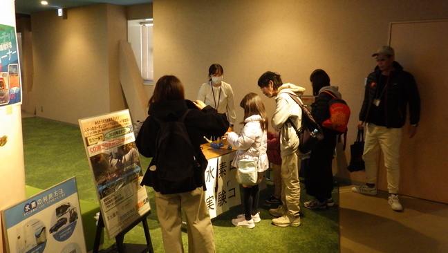 水素の利用方法(実用例)を紹介し、実験コーナーで水素ロケットを体験していただきました。※大阪市環境局出展