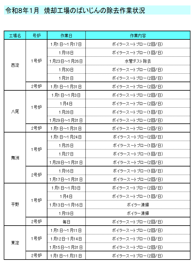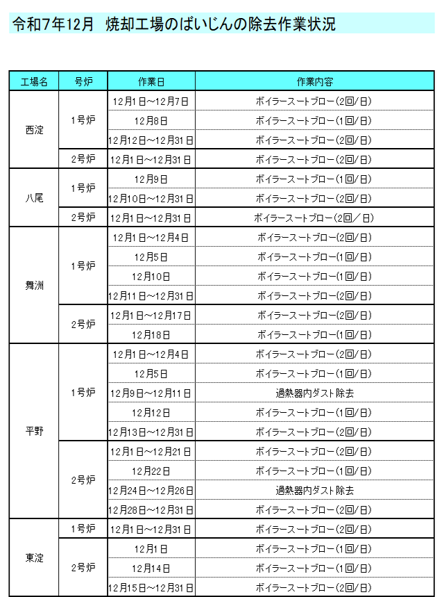 ばいじん除去作業状況 ※1 住之江工場のばいじん除去作業状況は、運営事業者ホームページに記載されています。 https://suminoe-ht.com/info/(外部リンク) ばいじん除去作業状況 令和7年度 令和6年度 令和5年度 令和4年度 焼却工場の運転状況については、各工場へお問い合わせください。お問合せ先