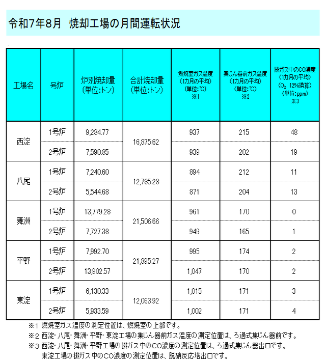 月間運転状況 処理する一般廃棄物の種類 処理する一般廃棄物の種類:可燃ごみ ※4 住之江工場の月間運転状況は、運営事業者ホームページに掲載されています。 https://suminoe-ht.com/info/(外部リンク) 月間運転状況 令和7年度 令和6年度 令和5年度 令和4年度 令和3年度 令和2年度 お問合せ先 焼却工場の運転状況については、各工場へお問い合わせください。